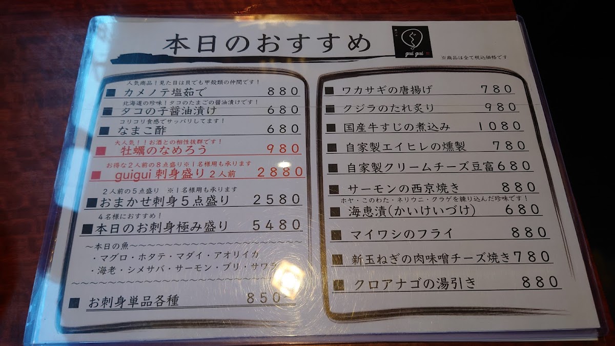 At Nihonshu Bar Gui Gui, located in the heart of Tokyo, the menu offers an array of delectable and authentic Japanese dishes that are sure to impress any food lover. The highlight of the menu includes 利き酒セット (Saké Tasting Set), a perfect way to sample a selection of premium saké varieties, allowing guests to explore the subtle differences in flavor and aroma. For those seeking a more substantial dish, the 牡蠣のなめろう (Oyster Namero) is a must-try. This fresh oyster dish is finely chopped and mixed with miso, creating a flavorful, savory bite. Another standout is the 刺し身盛り合わせ (Sashimi Platter), which offers a variety of fresh, high-quality sashimi that is meticulously prepared to ensure the best taste and texture.